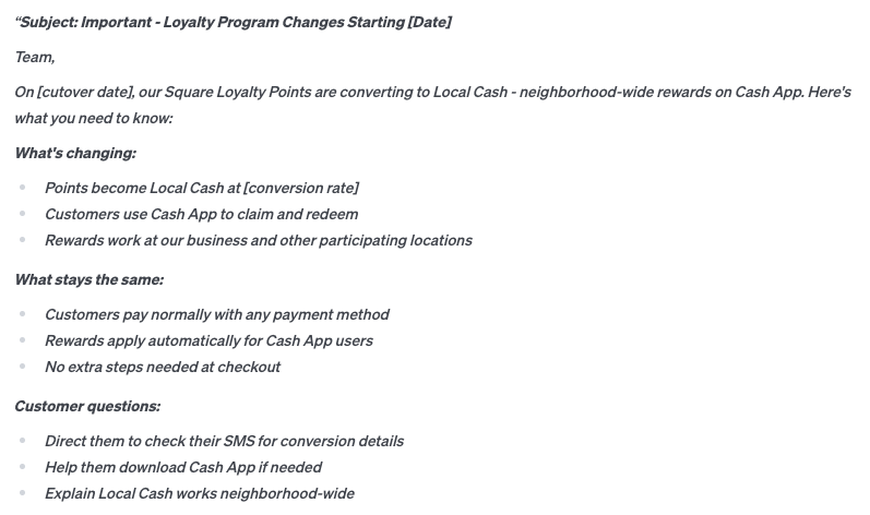 Your Square Product Specialist will guide you through this transition, which includes a preparation period before your customers' points automatically convert to Local Cash. After the demo, we’ll send you a notification email with more details about your conversation rate.